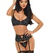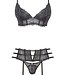 Het Aila setje is driedelig : een BH, een jarretelgordel en een bijpassende string. Overal komt de zeer luxe ogende sfeer terug van zwart met zilver.