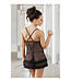 IR Brooke Set Mini-jurkje van fijn, rekbaar mesh De bh-cup is meerdere malen geplooid Met een kleine strass-gesp tussen de borsten Met verstelbare bandjes Aan de achterkant een V-vormige halslijn Bijpassende stringstring Maat: S, M, L, XL Kleur: zwart Materiaal: 73% Polyamide, 20% Polyester, 5% Elastaan, 2% Nylon