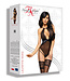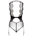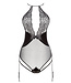 Verleidelijke body met halternek van delicate tule, zacht kant en glad materiaal. De vetersluiting over de nek is verstelbaar. Met een brede halslijn en een decoratieve strik in het midden onder de halslijn. Er zitten 2 ingenaaide en verstelbare jarretelbandjes De bandjes aan de zijkanten van de dijen benadrukken dit Billen Op de rug met een 3-voudig verstelbare haaksluiting Gesloten bij het kruis Let op: Zonder kousen Maat: S/M, L/XL Kleur: zwart Materiaal:. 88% Polyester 12% Elastaan