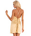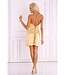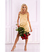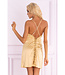 Verleidelijk hemdje van satijnachtig materiaal De gekruiste bandjes op de rug zijn verstelbaar Het zachte materiaal voelt prettig aan op de huid De opgenaaide bloemenkant geeft het shirt net dat beetje extra Een bijpassende string Maat: S/M, L/XL Kleur: goud Materiaal: 92% polyester, 8% elastaan
