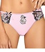 De roze string Nathala is van een zachte, lichtroze stof met een licht beige en zwart bloemenstiksel op een mesh ondergrond.