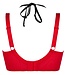 Met het zwarte, driehoekige kant, dat in de nek gestrikt of geknoopt wordt kun je deze rode open beha met zwarte details, ietsie (niet veel) de borsten liften.