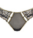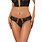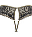 De string is gemaakt van zwarte tule aan de voorkant, verbonden met gouden ringen met bloemrijk zwart kant en gouden, glanzende banden. De achterkant van de string heeft een unieke snit in het midden, eveneens bedekt met gouden tapes.
